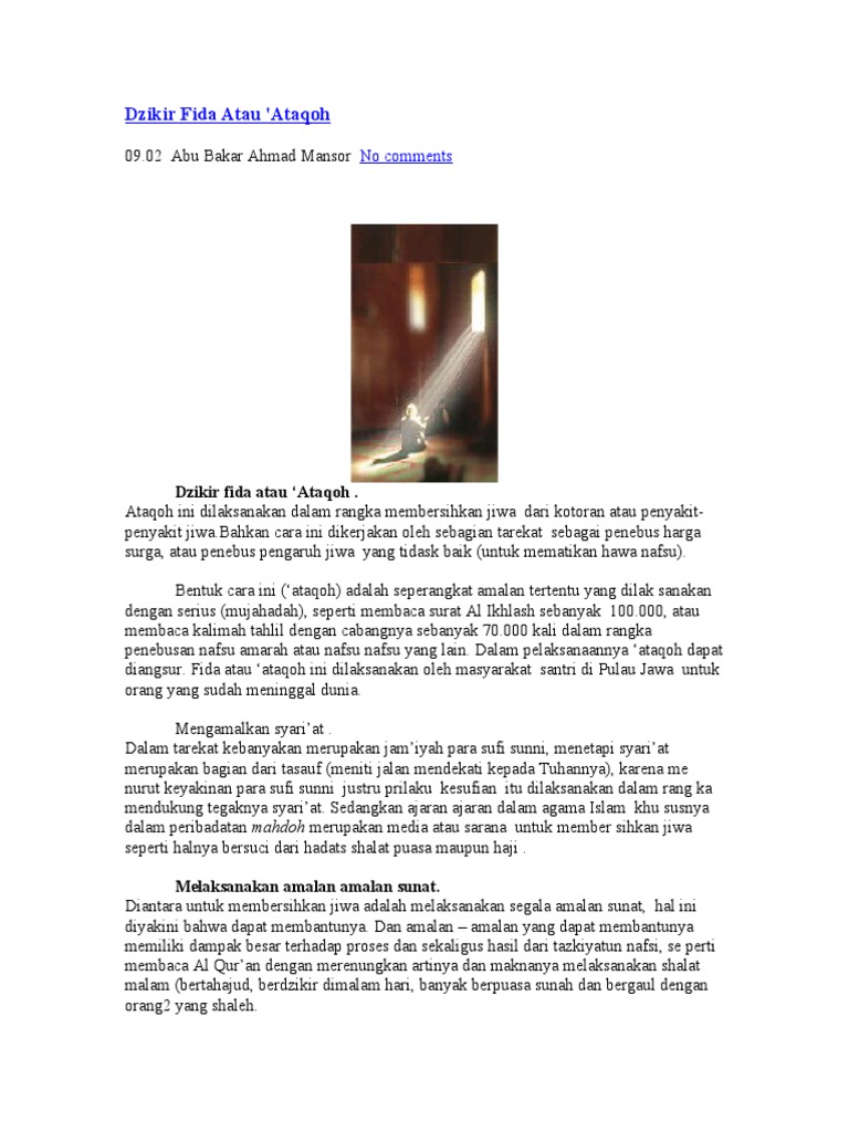 Karena sesungguhnya hanya orang jelek yang. Di antaranya dengan menyebut dan memuji nama Allah dan zikir adalah satu kewajiban yang tercantum dalam al-Quran. Dzikir Fida bisa dilaksanakan bagi diri sendiri atau hadiah untuk orang lain dan dapat dilaksanakan dalam satu majelis secara berjamaah atau sedikit demi sedikit hingga genap hitunganya.