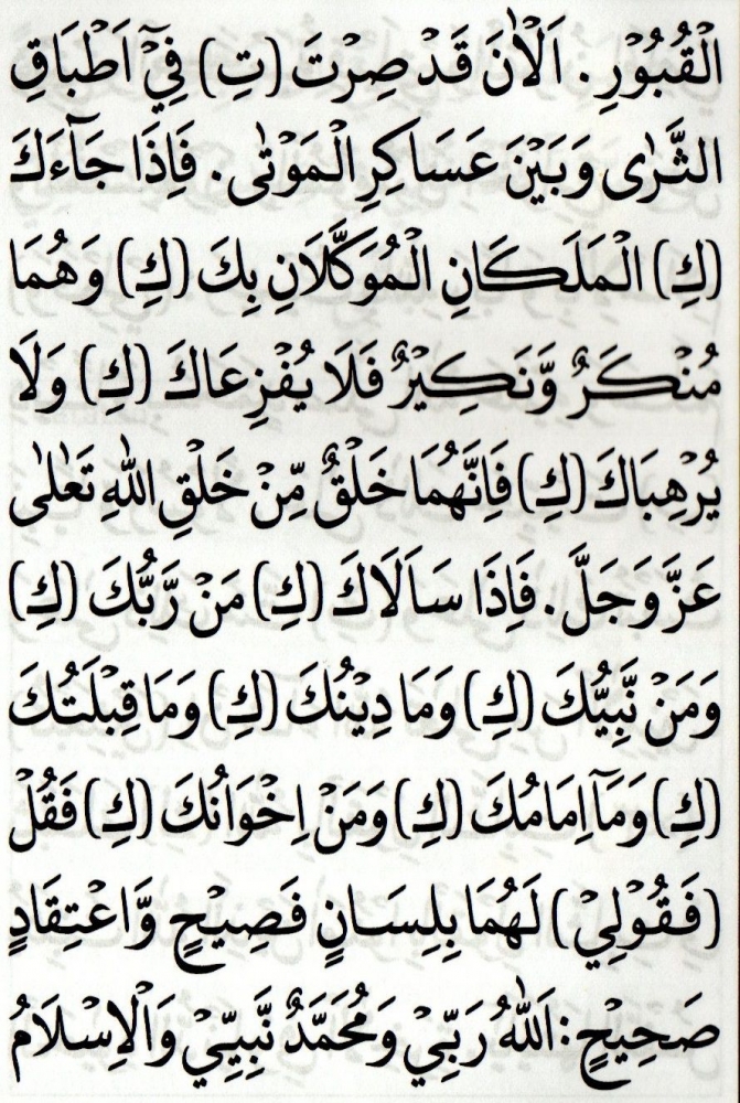 Jawaban beliau Talqin itu dilakukan ketika hendak meninggal dunia yaitu pada saat proses pencabutan nyawa. Mentalqin mayit setelah dikubur. Talqin itu dilakukan ketika hendak meninggal dunia yaitu pada saat proses pencabutan nyawa.